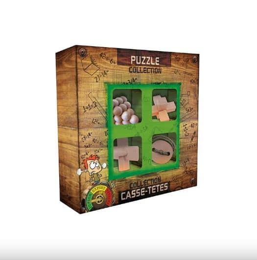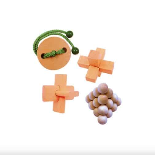 Contient 4 casse-têtes en bois à résoudre. Niveau Junior, difficulté 1/4.