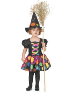 La robe est courte et se ferme par un scratch. La partie jupe, en tissu satiné, est imprimée de pois de toutes les couleurs sur un fond de couleur noire. Elle est habillée d’un tutu en tulle rose, cousu au niveau de la taille. Le haut de la robe présente un faux laçage multicolore.
