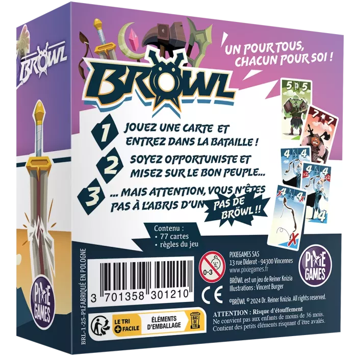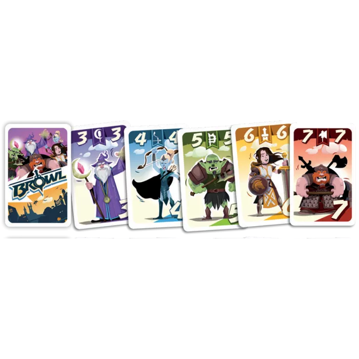 Dans BROWL, piochez, jouez, anticipez mais prenez garde à la valeur inscrite sur les cartes des différents Peuples. Dès que la somme des cartes d’un Peuple présentes sur la table atteint cette valeur, ce Peuple remporte la bataille ! Tous les joueurs ayant des cartes de ce Peuple en jeu peuvent alors les sécuriser et amasser des points pour la fin de manche.