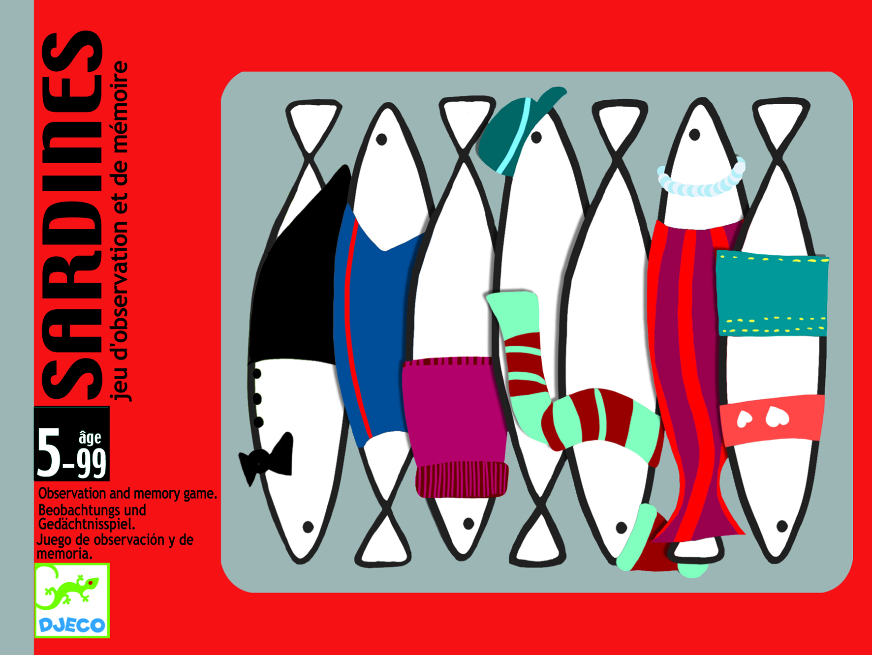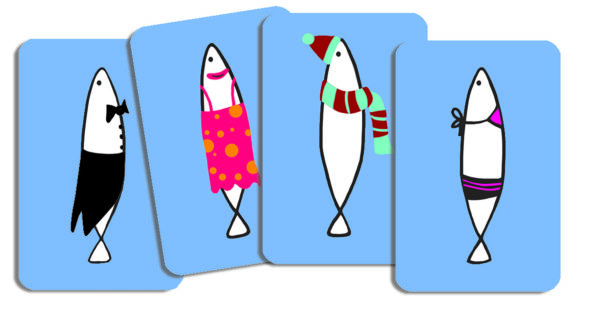 Observer et mémoriser les habits des sardines représentées sur la grande carte. Retourner cette grande carte afin de cacher sa face. Chaque joueur retourne sa pioche et doit se rappeler si sa sardine est représentée sur la grande carte…