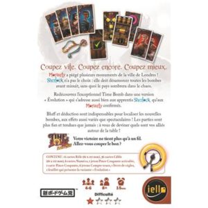 Tout en conservant les principes qui ont fait le succès de son illustre prédécesseur, Time Bomb Évolution s’adresse aussi bien aux apprentis Sherlocks qu’aux habitués de cet exceptionnel jeu de bluff. Avec cette version Évolution, Time Bomb gagne désormais une intensité nouvelle avec de multiples bombes à désamorcer, ainsi que des effets dramatiques susceptibles de se déclencher à chaque désamorçage.