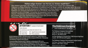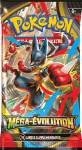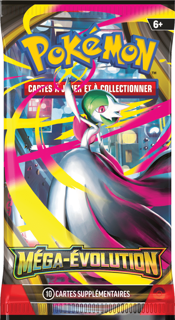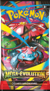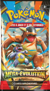 Le booster contient 10 cartes, en assortiment aléatoire. Chaque booster de l’extension Méga-Évolution du JCC Pokémon contient 10 cartes, 1 énergie de base ou 1 carte à code pour le JCC Pokémon Live.