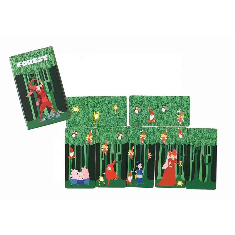 Principe du jeu : Avec leurs cartes, les joueurs forment une forêt infinie où se cachent des créatures mythiques. Dès que 7 créatures identiques apparaissent sur les cartes, soyez le premier à vous en emparer. Le joueur avec le plus de cartes à la fin de la partie gagne… ou bien, variante, débarrassez vous de vos cartes en coinçant vos adversaires!