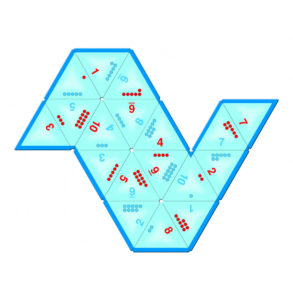 Pour jouer aux Triominos, on utilise la règle du jeu de dominos. Les 18 cartes triangulaires sont disposées de manière que le résultat figurant sur l’un des côtés d’un triangle donné jouxte l’opération portée sur le côté du triangle voisin. Au fur et à mesure que le jeu progresse, les triangles s’ajoutent les uns aux autres et dessinent une figure qui permet de contrôler la justesse des opérations.