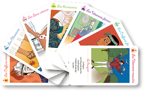 Chaque fois que l’on se passe une carte, il faut prononcer le nom de la famille et celui du vêtement ; l’enfant les connaît vite par cœur…. Nous avons même découpé les illustrations d’un vieux jeu et jouons sans les textes : aucun problème à l’âge de 7 ans !