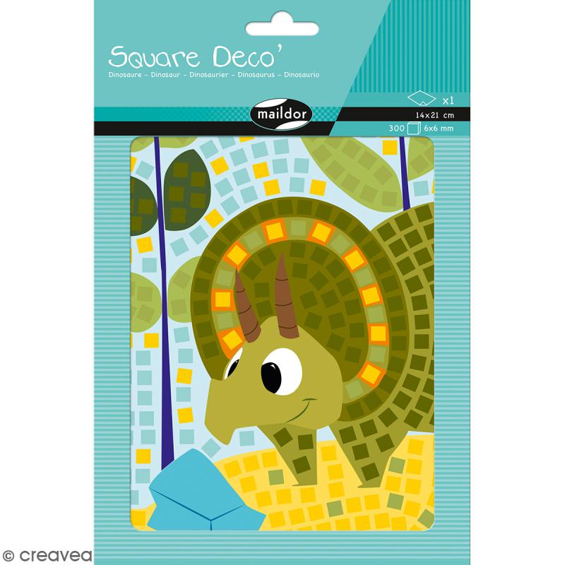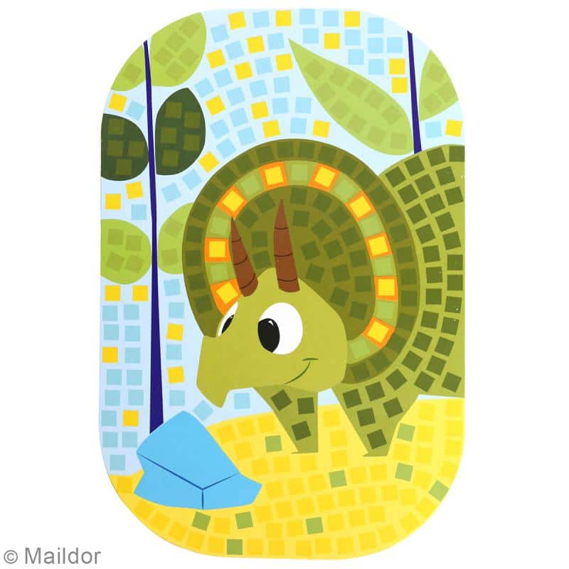 2 planches de 300 stickers mosaïques (6×6 mm) sur un thème dinosaure, à coller sur 1 support imagé de dimension 14×21 cm.