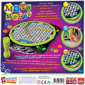 L’un des joueurs tourne le plateau d’un cran et lit à voix haute le premier mot qui apparaît. Dès lors, tous les joueurs parcourent la grille du regard à la recherche de ce mot. Dès qu’un joueur a repéré le mot recherché, il doit attraper le pouêt-pouêt. S’il y parvient, il peut recouvrir le mot en question avec ses lentilles. Dans le cas où il se serait trompé, il repose le pouêt-pouêt et ne peut plus participer à la recherche de ce mot. Une fois le mot recouvert, on tourne le plateau d’un cran dans le sens des aiguilles d’une montre pour faire apparaître le mot suivant.Les mots peuvent être cachés de gauche à droite, de droite à gauche, de haut en bas, de bas en haut, horizontalement, verticalement ou encore en diagonale… mais toujours en ligne droite, jamais en zigzag (voir fig. 3). Certains mots peuvent se croiser. Si vous trouvez un mot dont l’une des lettres a déjà été utilisée par un adversaire, retirez sa lentille et remplacez-la par la vôtre. La partie se termine quand la section noire s’affiche de nouveau dans la zone de lecture sur la grille. Tous les mots mêlés ont alors été découverts, il ne reste plus qu’à compter les points de chacun. Le joueur ayant placé le plus de lentilles de sa couleur sur la grille remporte la partie.