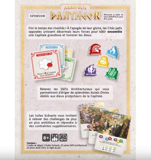 Avec AKROPOLIS PANTHÉON, jouez à AKROPOLIS en mode coopératif où la gestion des Pierres, la coordination des placements et l’anticipation des Défis sont essentielles pour atteindre la victoire !
